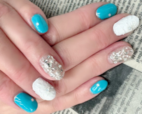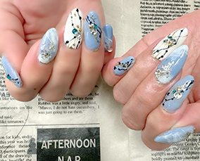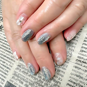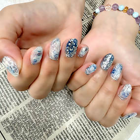 ブルーニュアンスに薬指はシルバー蔦柄にパール。 |