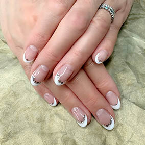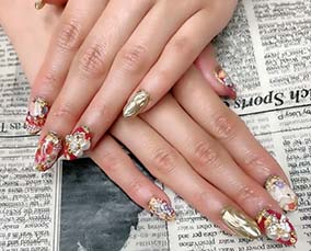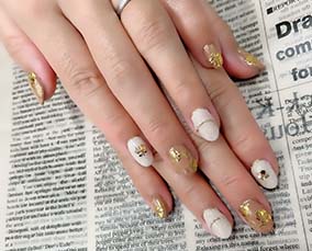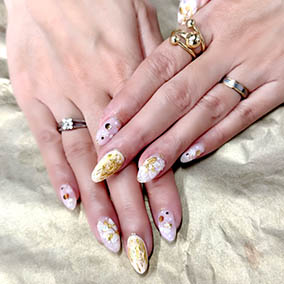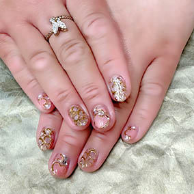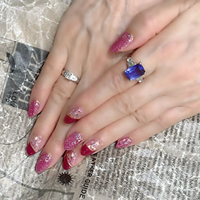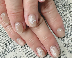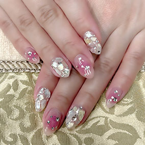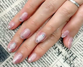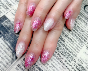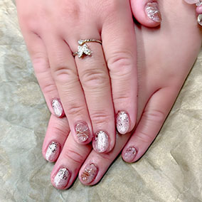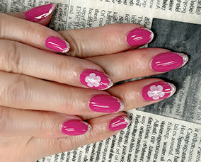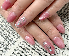 ベルサイユピンク全塗りに薬指白花でレディライクに。 |