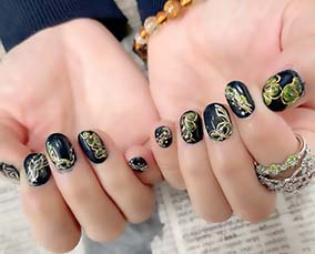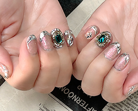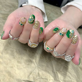 マダムのジュエリーに合わせたエメラルドネイル。 |