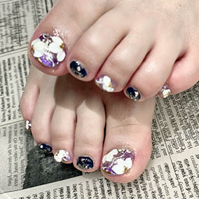 パープルとアイボリーの花手水ネイル★サンダルに◎ |