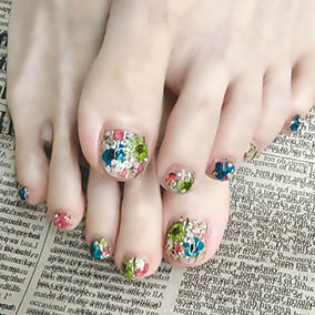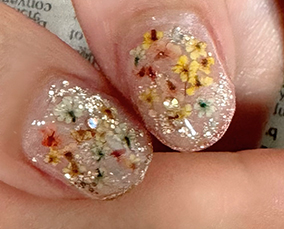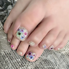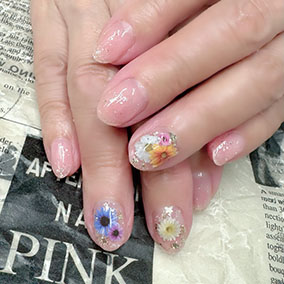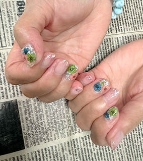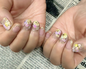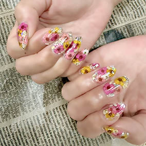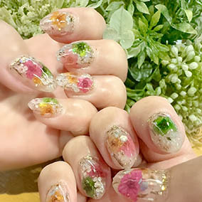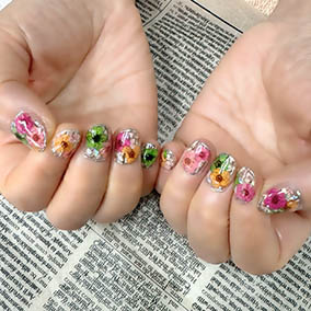 カラフルな押し花たくさん使った花手水ネイル。 |
