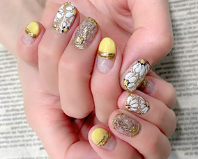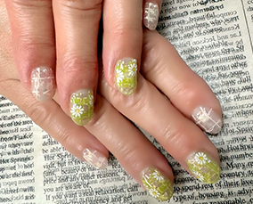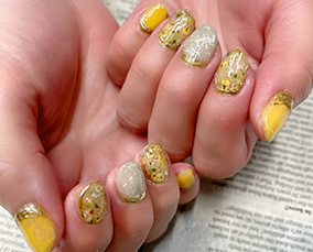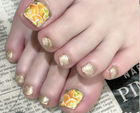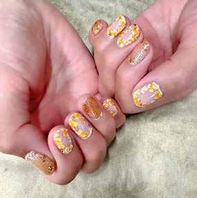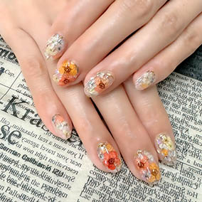 黄色、黄緑、オレンジ使用した夏にピッタリ!押し花ネイル。 |