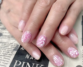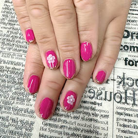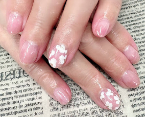 8月おすすめデザイン。可憐なフラワーアート。 | ベルサイユピンク全塗りに透け感ある白花フラワー。 |