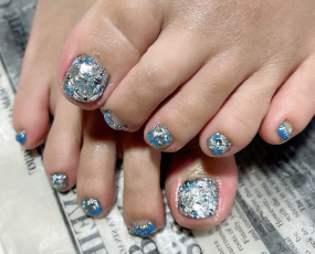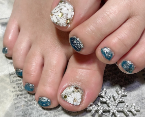 ブルーのクリスマスネイル。足はフラワーと雪がおしゃれ。 |