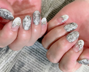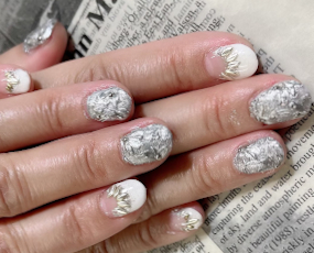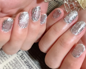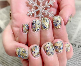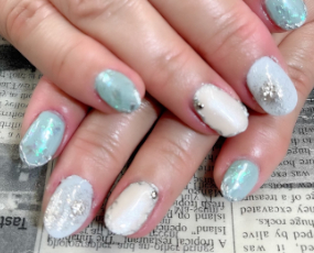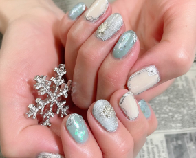 ミラー、新色ラメ、新色雪パーツ使用したトレンドネイル。 |