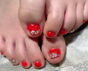 オレンジレッドにニュアンスミラーシルバー。明るく年越しできそう! |