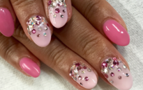 2色のピンクネイルにビジューをのせてパーティーにも◎ |