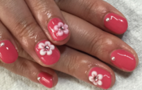 ビビットピンクのネイルにかわいらしいお花とパールを。 |