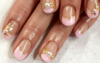 パステルピンクのフレンチ。ゴールドとパールでかわいらしく♪ |