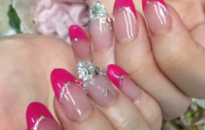 蛍光ピンクフレンチにビジュー!右薬指にはイニシャルオン♡ |