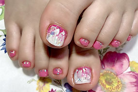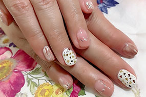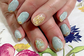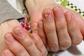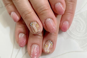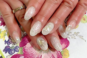 シャインフレークやナチュラルクラッシュシェルのニュアンスネイル。 |
