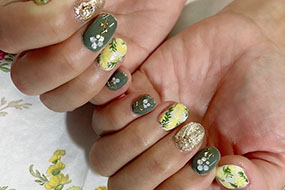 セージ色と黄色押し花で春待ちネイル。 |