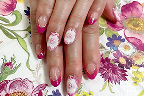 ベルサイユピンクに大きめ白花アート。ミラーでニュアンスライン。 |