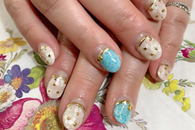 ティファニーブルーにビジュ-ミラーネイルにアール・ヌーヴォー柄。 |