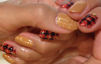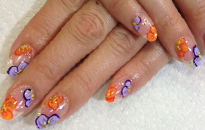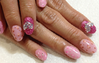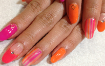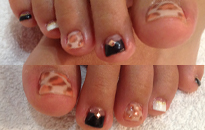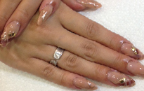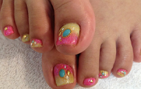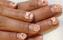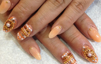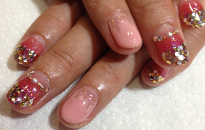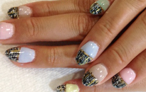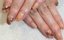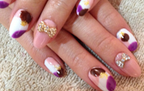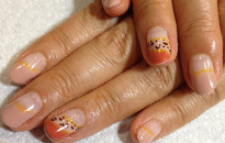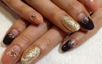 | 流行のモロッコネイル。ポップで元気なイメージに。 | ピンクベースにゴールドのホログラムをたくさん乗せました。 | ベージュベースでシンプルながら、ポイントに秋色とヒョウ柄で秋ネイル。 |