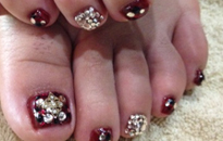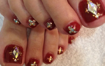 | オレンジをベースに、パールやブリオンを乗せた秋の贅沢ネイル! | 秋色フットネイル。ストーンたくさんでギラギラに。 | 秋色を取り入れたモダンネイル。アクセントにリボンを。 |