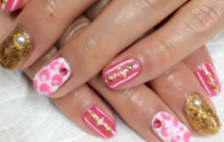 9月の定額おすすめネイル。ピンクのヒョウ柄とストライプとゴールド! |