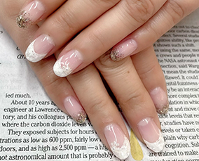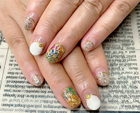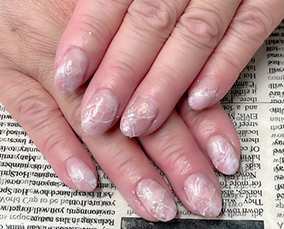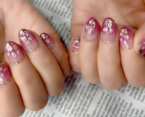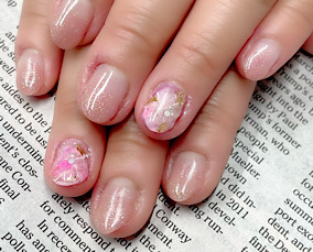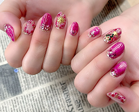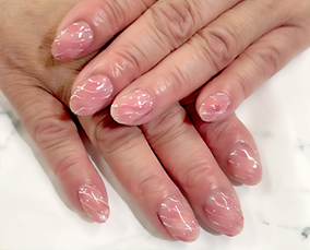 ベルサイユピンク全塗りに薬指白花でレディライクに。 |