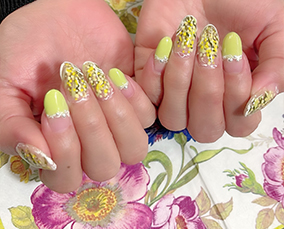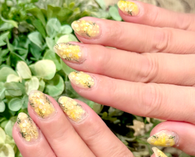 黄色、黄緑、オレンジ使用した夏にピッタリ!押し花ネイル。 |