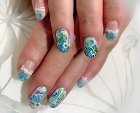 ジルコンブルー大好き。花手水ネイルで涼しげに。 |
