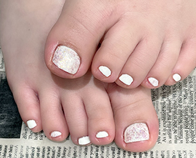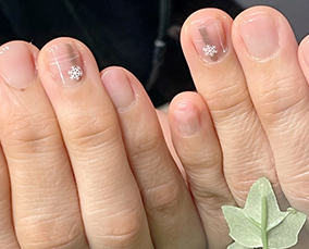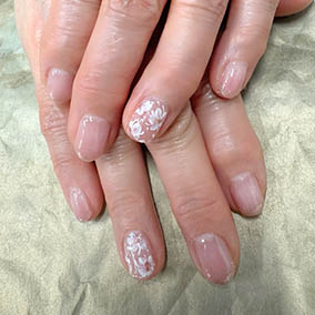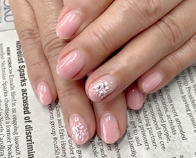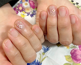 薬指に白花アート。爪先にほんのりラメあしらいました。 |