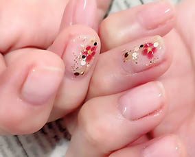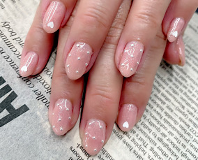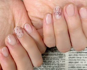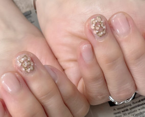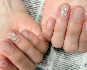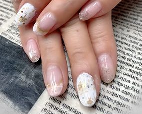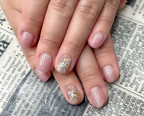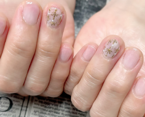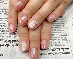 シンプルに薬指はシェルや押し花で上品アート。 |