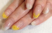 お花の花びらをフレンチ形に乗せた、清楚でキレイめネイル。