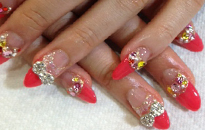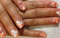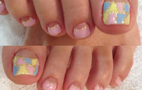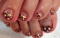 | 流行のモロッコネイル。ポップで元気なイメージに。 | ピンクベースにゴールドのホログラムをたくさん乗せました。 | ベージュベースでシンプルながら、ポイントに秋色とヒョウ柄で秋ネイル。 |